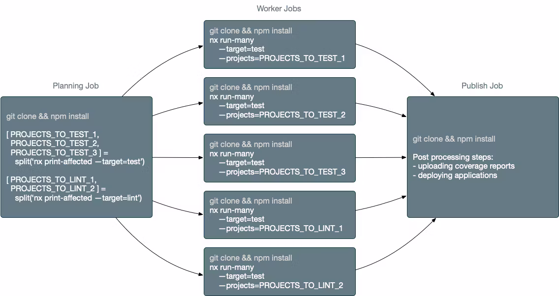 The planning job invokes print-affected. This command executes the same logic as "affected:*" but instead of running the tasks, it returns the tasks' descriptions. The job invokes this command for each target such as build/test/lint/e2e. After that, each worker agent runs the tasks assigned to it.